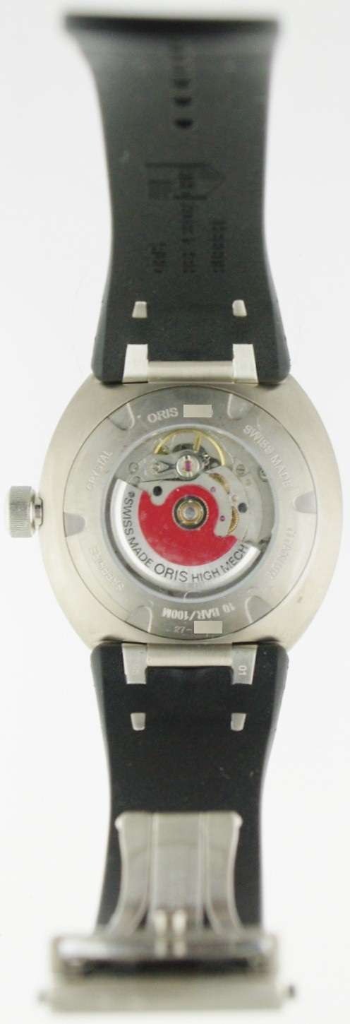TT3デイデイトシリーズのダイアルはリアルカーボン使用。チタニウム製ブレスレットタイプにオリス独自開発のフレキシブルラグで実現した完璧な装着感。シースルーバックを通して見えるオリスレッドローター付き最高です。 |